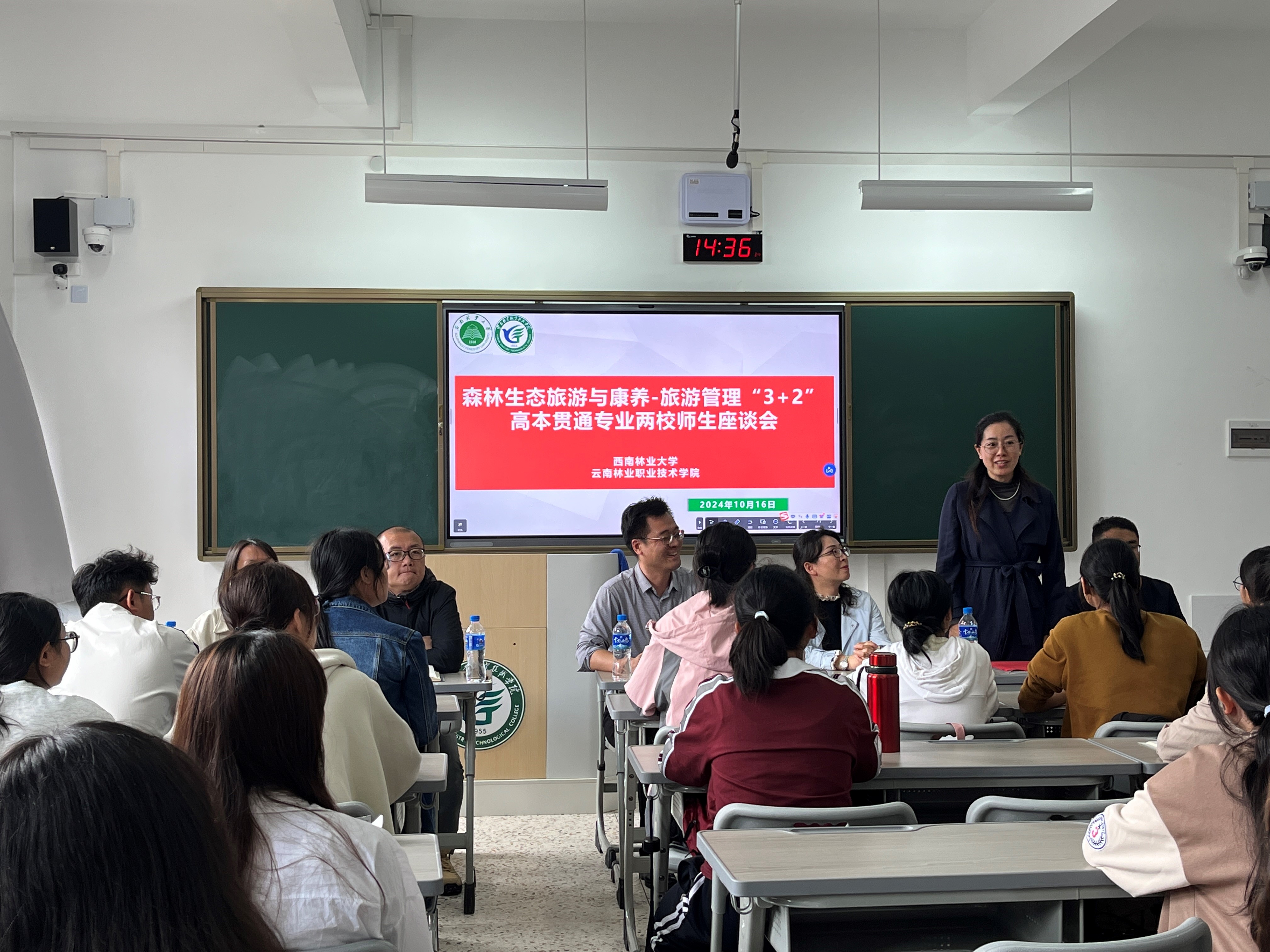 为响应国家及云南省关于职业教育与本科教育贯通培养的政策精神,10月16日9728太阳集团与云南林业职业技术学院文化旅游学院在云南林业职业技术学院石林校区联合举办了森林生态旅游与康养-旅游管理“3+2”高本贯通专业师生座谈会。此次座谈会由云南林职院文化旅游学院副经理王丽娟主持,9728太阳集团院领导、旅游管理系主任和云南林职院文化旅游学院院领导、森林生态旅游与康养(高本贯通)班辅导员和全体同学出席了此次会议。