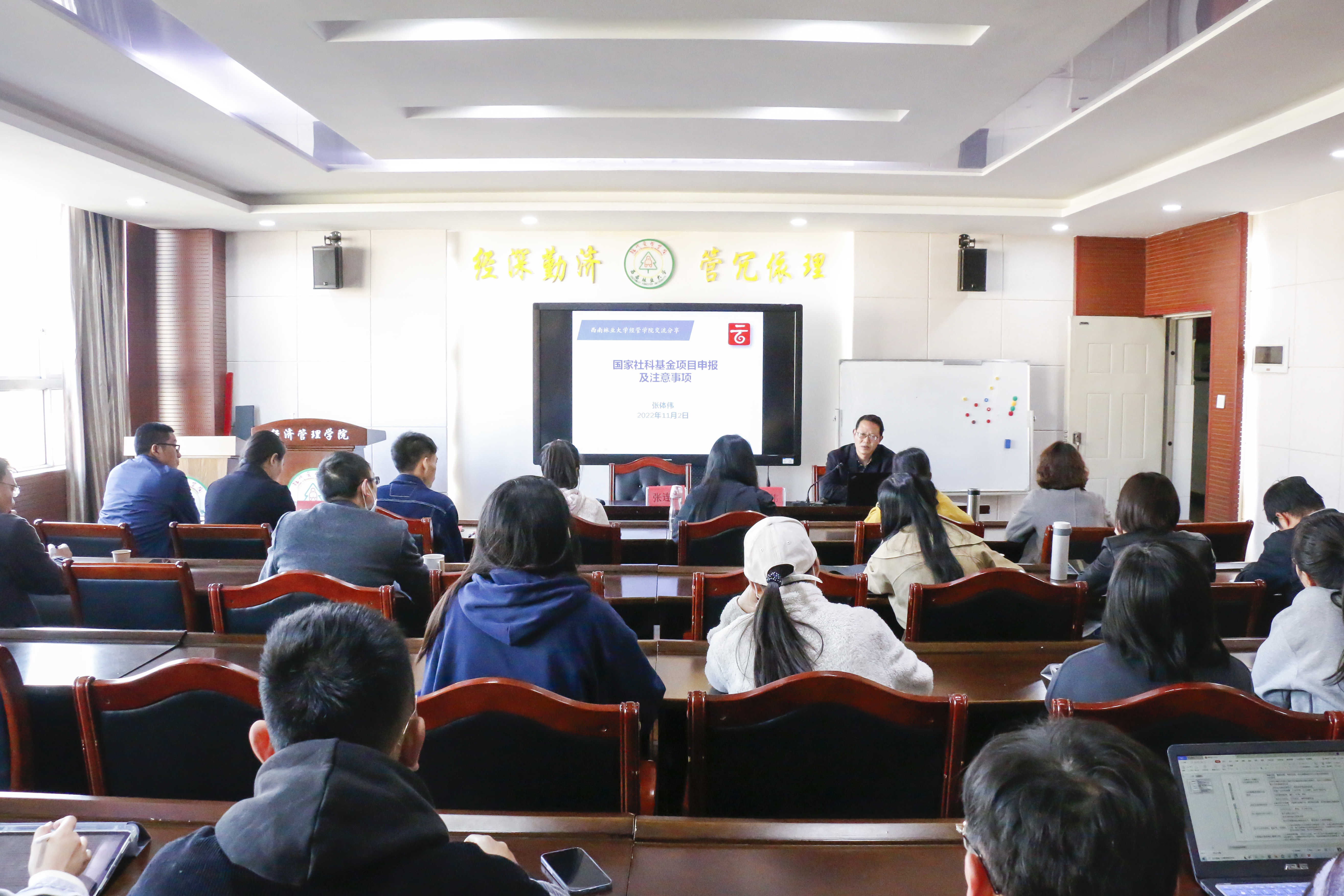 为进一步推动9728太阳集团国家社科基金申报工作,提升学院教师的科研和学院学科发展水平,11月2日上午,云南省社会科学院农村发展研究所二级研究员、省中青年学术技术带头人、“省突”“省贴”专家张体伟,应9728太阳集团邀请就国家社科基金申报工作开展申报辅导和交流。9728太阳集团副经理(主持工作)张连刚教授主持会议,9728太阳集团和其他学院及部门的近60名师生参加。