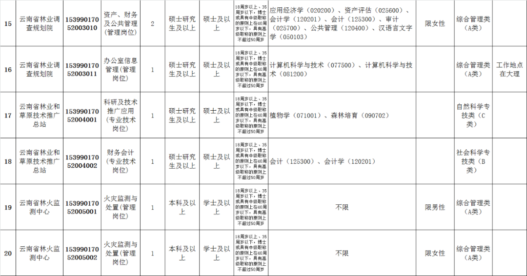 (三)云南省林业调查规划院公开招聘工作人员19名。