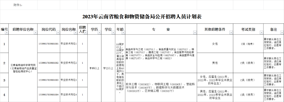 云南省粮油科学研究院(云南省粮油产品质量监督检验测试中心)公开招聘人员4名;以上1家单位共公开招聘工作人员4名。具体招聘岗位及招聘条件,详见《2023年云南省粮食和物资储备局公开招聘人员计划表》(附件1)。