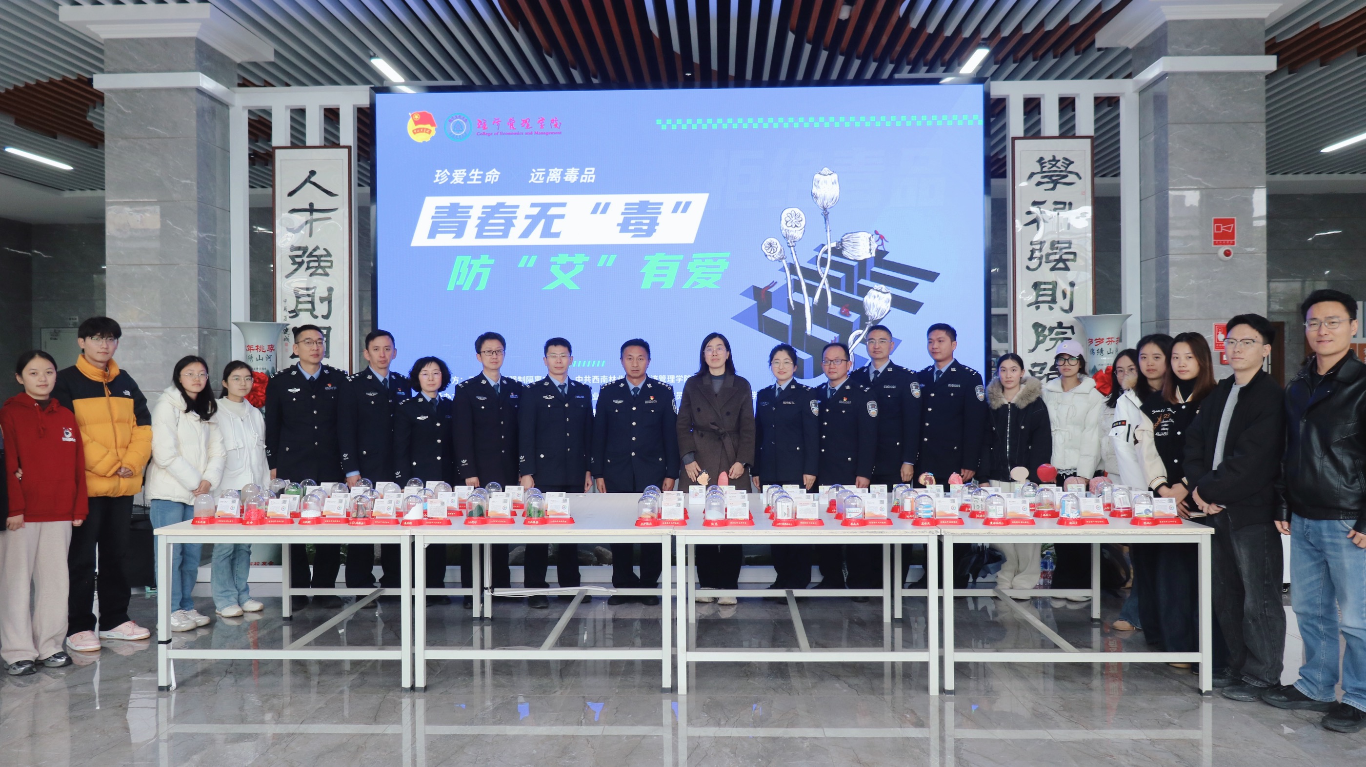 实操体验环节设在经管楼一楼大厅。警官们通过展示仿真毒品模型、进行现场演示和互动答疑,让同学们能够“零距离”认清毒品的各种伪装,直观了解其危害,并学习掌握科学的防毒拒毒技巧。这种沉浸式的互动体验极大地激发了同学们的参与热情,巩固了讲座所学知识。